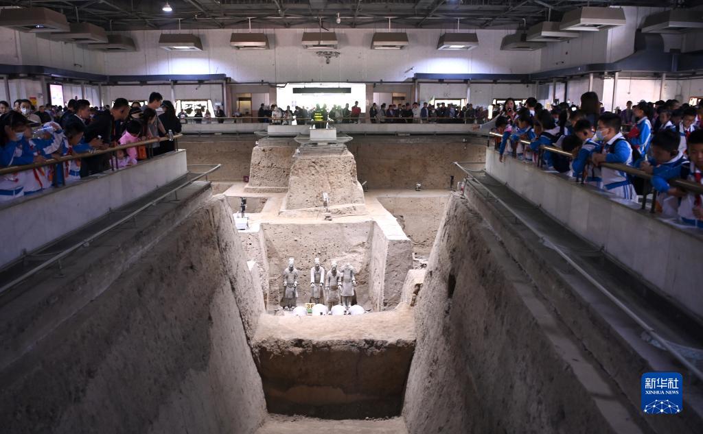 4月26日,游客在秦兵馬俑三號坑遺址內參觀(guān)。