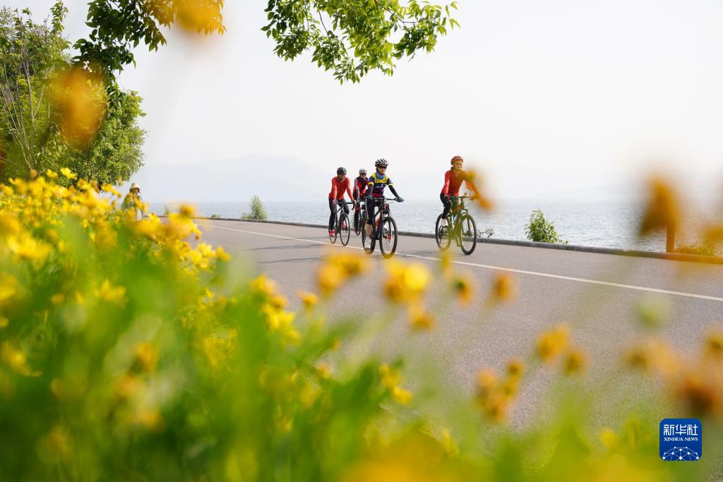 4月20日,騎行愛(ài)好者在云南大理洱海生態(tài)廊道騎行。