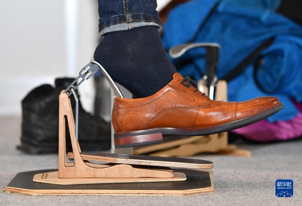 這是4月26日在瑞士日內瓦舉行的第48屆日內瓦國際發(fā)明展上拍攝的一款穿鞋器。