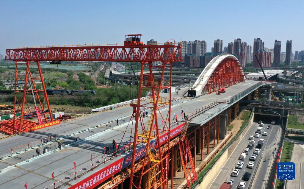 這是鋼箱梁合龍后的鄭州北三環(huán)新建彩虹橋(4月27日攝,無(wú)人機照片)。