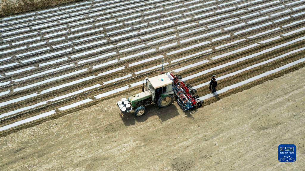 新疆尉犁縣巴西買(mǎi)里村,爾肯·熱衣木駕駛拖拉機春播(4月17日攝,無(wú)人機照片)。