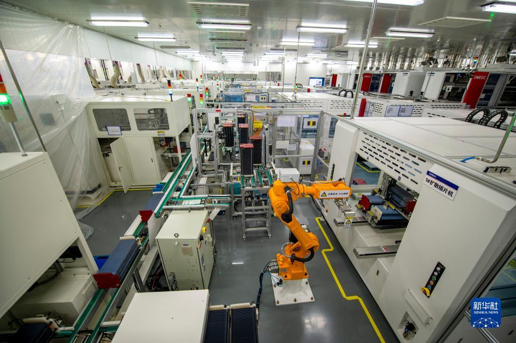 4月27日,在位于浙江省東陽(yáng)市的橫店?yáng)|磁太陽(yáng)能電池片未來(lái)工廠(chǎng),自動(dòng)化機械手臂在轉動(dòng)工作,實(shí)現5G專(zhuān)網(wǎng)應用智能化生產(chǎn)。