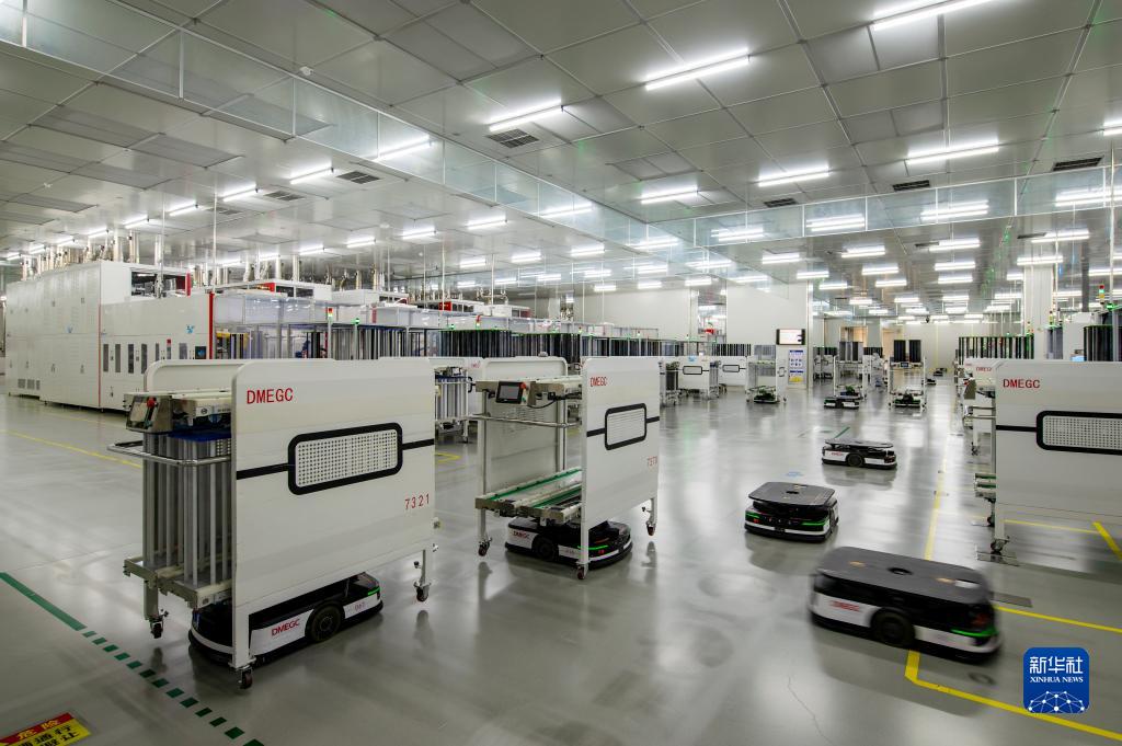 4月27日,在位于浙江省東陽(yáng)市的橫店?yáng)|磁太陽(yáng)能電池片未來(lái)工廠(chǎng),AGV(自動(dòng)導引運輸)小車(chē)穿梭在各個(gè)生產(chǎn)單元之間,承擔了物流搬運的工作。