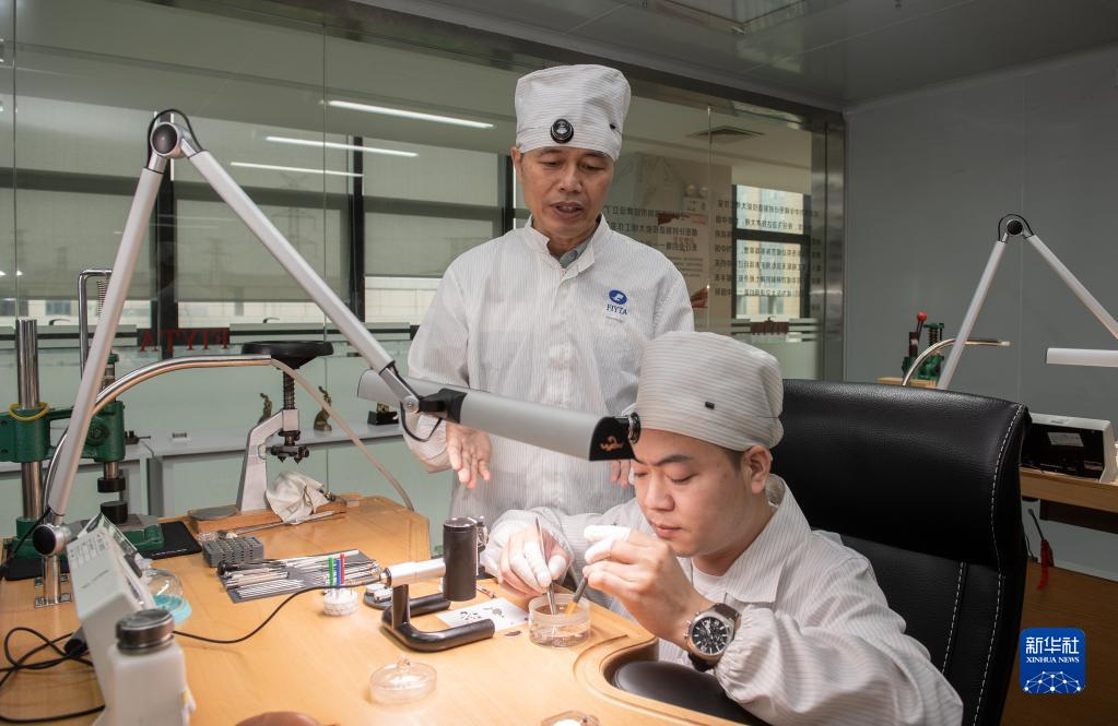4月25日,在位于深圳的飛亞達鐘表大廈,劉中華指導徒弟進(jìn)行手表拆卸和清洗。新華社記者 毛思倩 攝