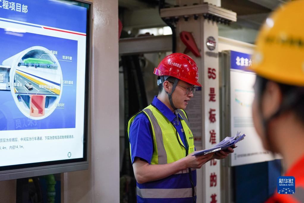 在北京東六環(huán)入地改造工程的西線(xiàn)隧道內,黃魯在開(kāi)班前會(huì )(4月19日攝)。