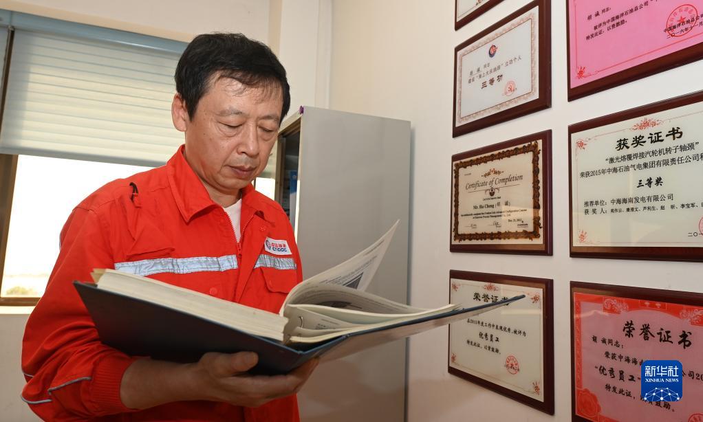 胡誠在位于海南儋州洋浦經(jīng)濟開(kāi)發(fā)區的中海海南發(fā)電有限公司創(chuàng )新工作室內查閱資料(4月20日攝)。