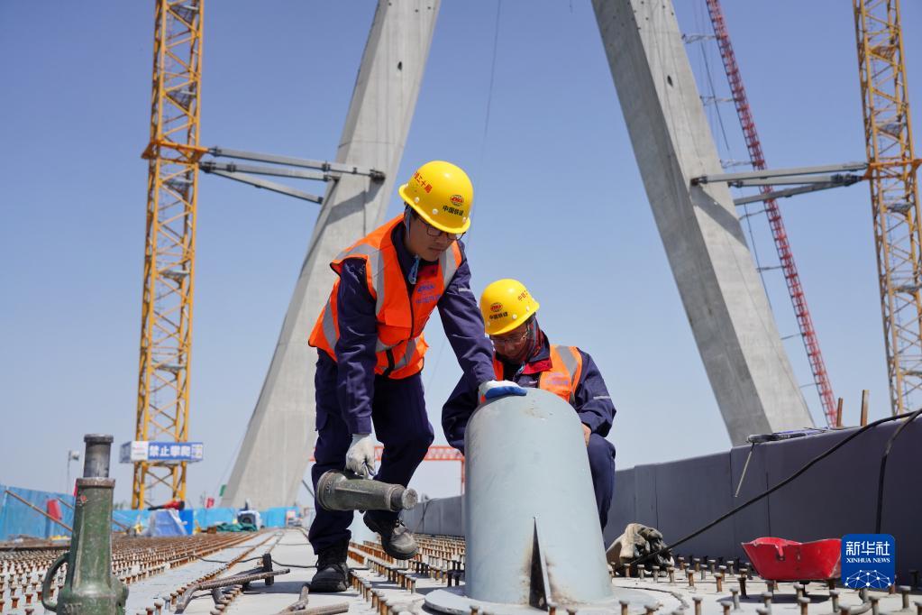 4月29日,工人在石家莊市學(xué)府路東延跨太平河橋主橋合龍現場(chǎng)施工。