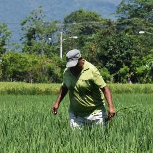 4月26日,在多米尼加首都圣多明各西北約80公里處,中國農業(yè)專(zhuān)家(前)在多米尼加國家水稻培訓中心的一片試驗田內工作。
