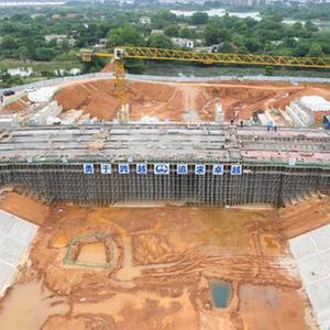 5月2日在沅江市中心城區水環(huán)境綜合治理一期工程拍攝的團山橋建設現場(chǎng)(無(wú)人機照片)。