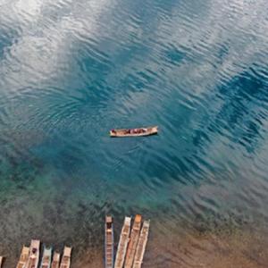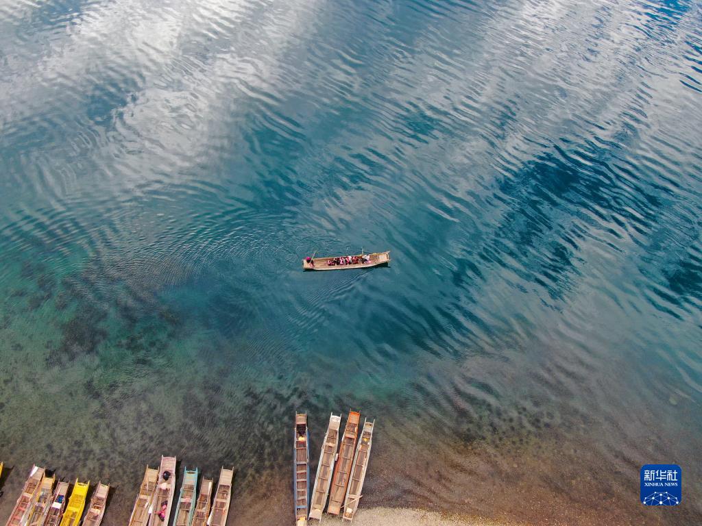 5月2日,游客在云南省麗江市寧蒗彝族自治縣境內的瀘沽湖乘船游覽(無(wú)人機照片)。