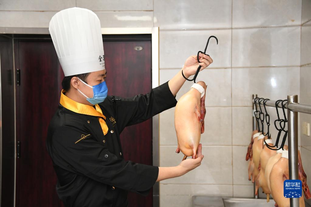 在全聚德王府井店,夏志鵬在烤制前檢查鴨坯(4月27日攝)。
