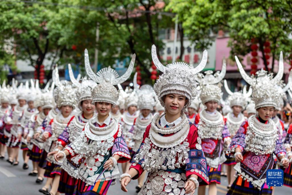 5月2日,人們在貴州省臺江縣參加苗族姊妹節盛裝巡游。