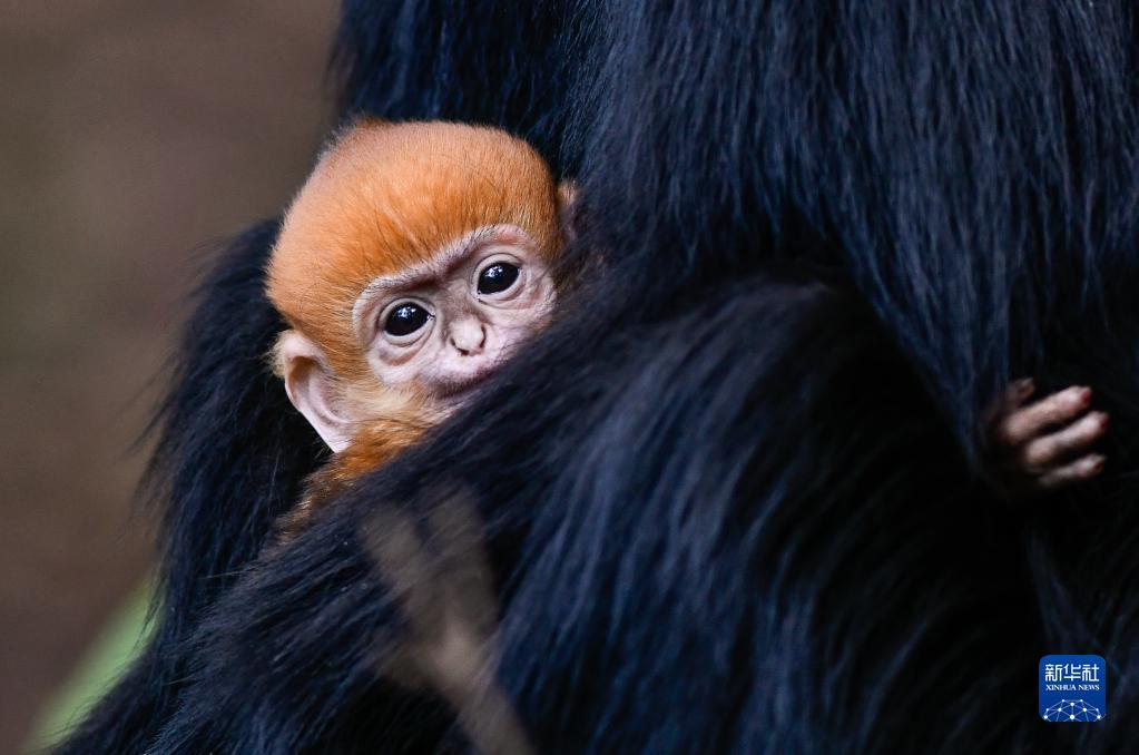 在貴州麻陽(yáng)河國家級自然保護區拍攝的黑葉猴幼猴。新出生的黑葉猴毛色呈金黃色,幾個(gè)月后逐漸變成黑色(4月30日攝)。
