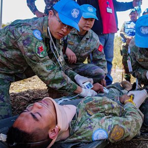 5月3日,在黎巴嫩南部邊境“藍線(xiàn)”附近雷場(chǎng),參與演習的中國第21批赴黎巴嫩維和多功能工兵分隊醫療組對“傷員”傷情進(jìn)行前期處置。