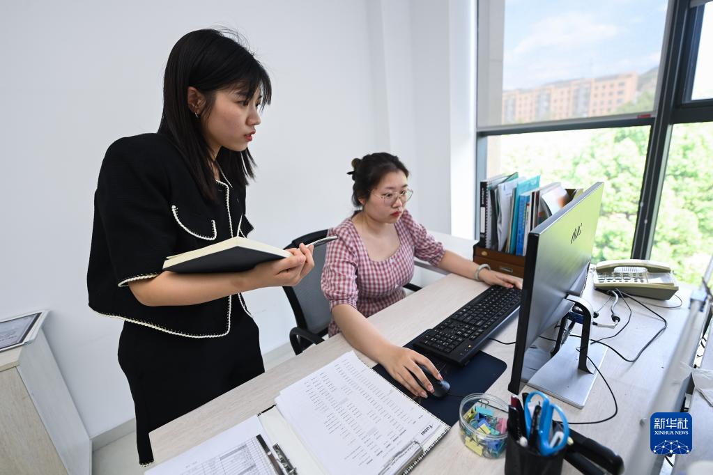 5月5日,諸暨市財政部門(mén)工作人員(左)在電腦前指導符合規定的外貿企業(yè)線(xiàn)上申請財政補助。