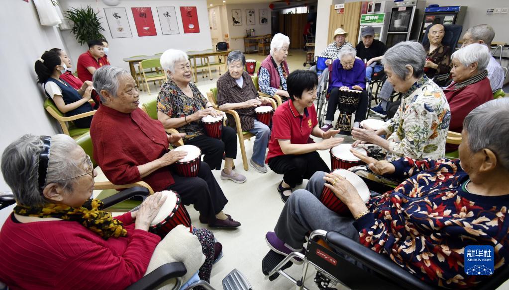 朝陽(yáng)無(wú)限社區的老年人在社區養老驛站學(xué)習手鼓演奏(5月17日攝)。