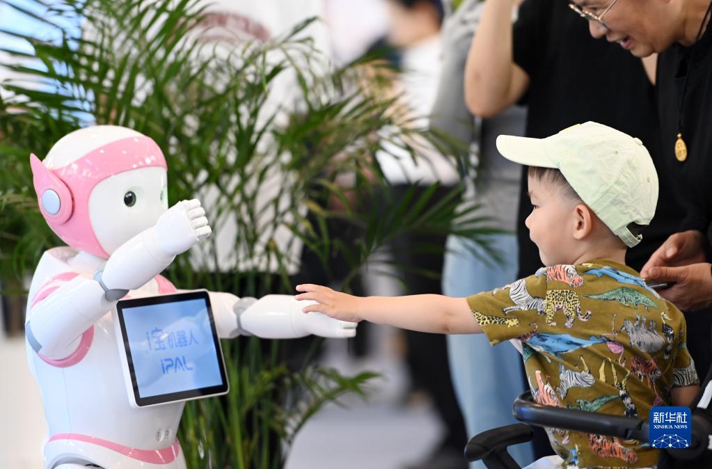 5月19日,一名兒童在第七屆世界智能大會(huì )智能科技展上和一款機器人互動(dòng)。