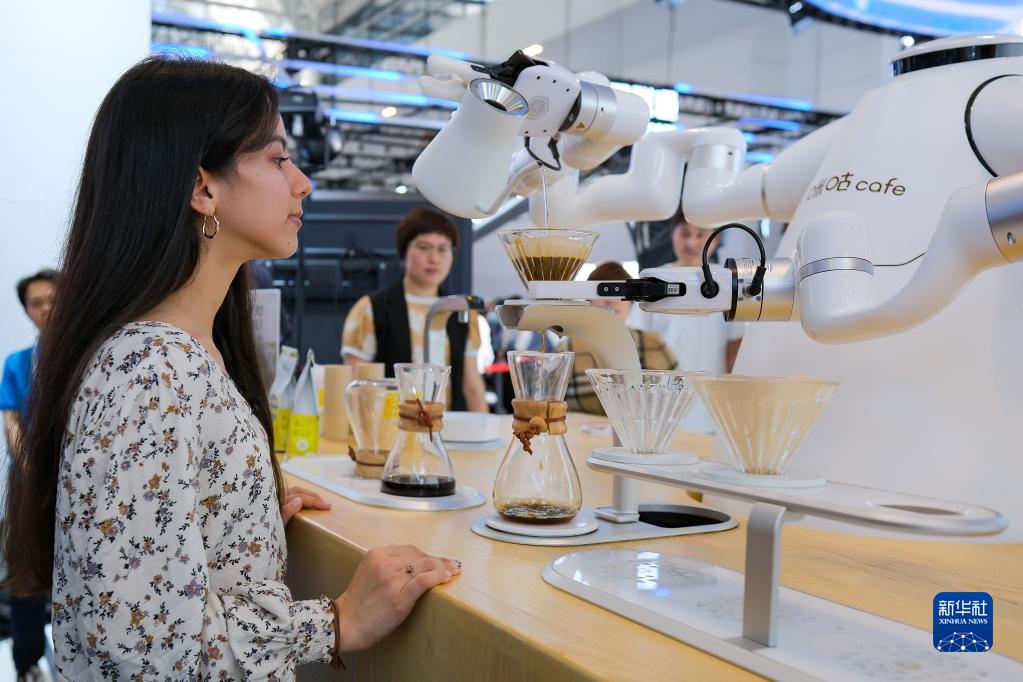 5月18日,觀(guān)眾在第七屆世界智能大會(huì )智能科技展上體驗機器人“手沖”咖啡。
