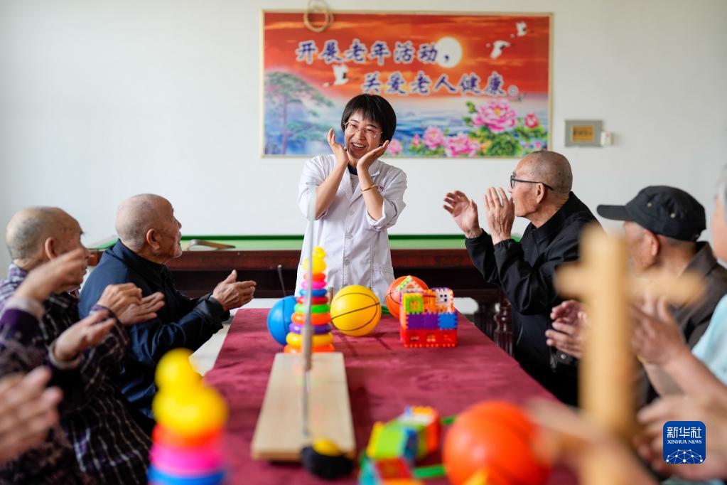 5月19日,河北省灤南縣一家養老機構的工作人員在陪老人做益智游戲。