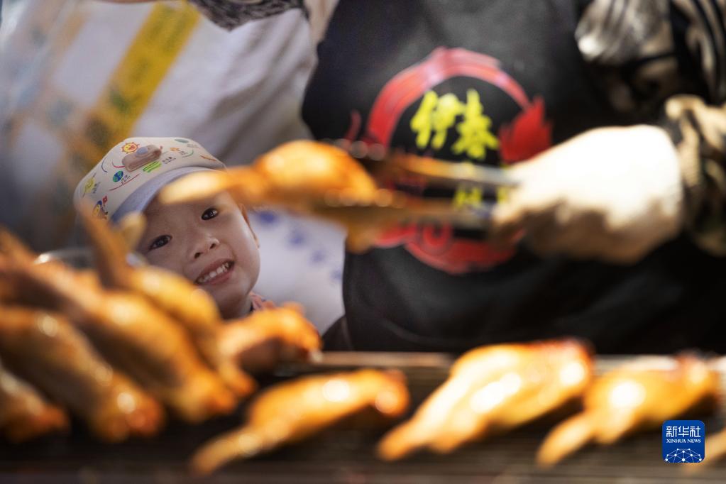 5月19日,在伊春夜市,小朋友等待美食出爐。