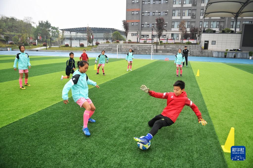 在瀘州天立春雨學(xué)校足球場(chǎng),來(lái)自涼山彝族自治州的舍布么扯鳩莫(前左)與男隊一起訓練(3月29日攝)。