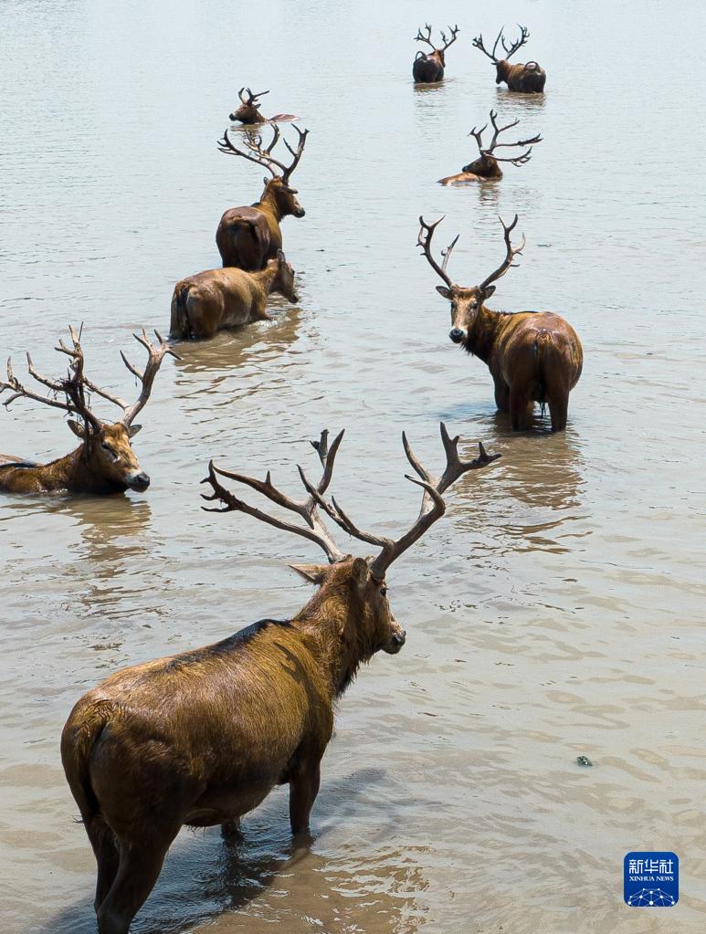 5月19日,一群麋鹿在湖北石首麋鹿國家級自然保護區內活動(dòng)(無(wú)人機照片)。