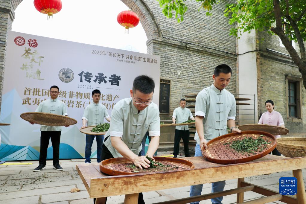 5月21日,工作人員在茶文化非遺項目展示交流活動(dòng)上展示武夷巖茶(大紅袍)傳統制作技藝。