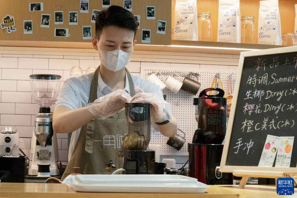5月5日,在位于重慶市渝北區松山醫院內的一角咖啡廳內,張凌云為顧客制作飲品。