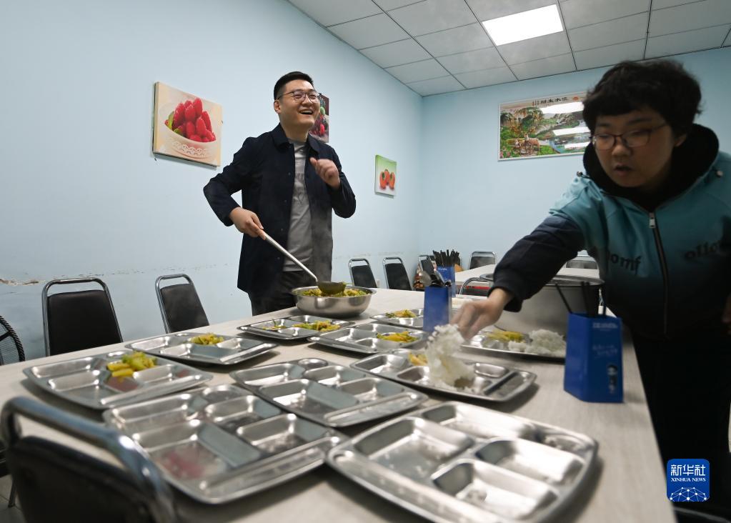 趙強(左)在陽(yáng)光家園食堂為學(xué)員準備午餐(4月18日攝)。