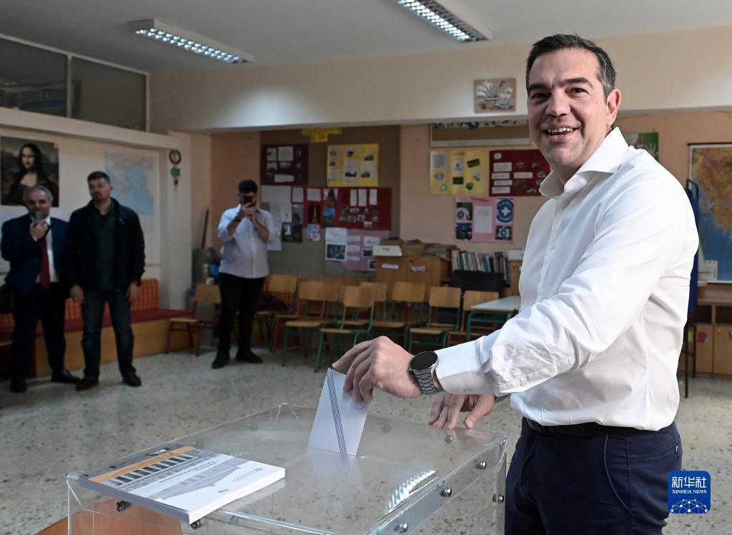 5月21日,希臘前總理、激進(jìn)左翼聯(lián)盟領(lǐng)導人亞歷克西斯·齊普拉斯在雅典一處投票站參加投票。