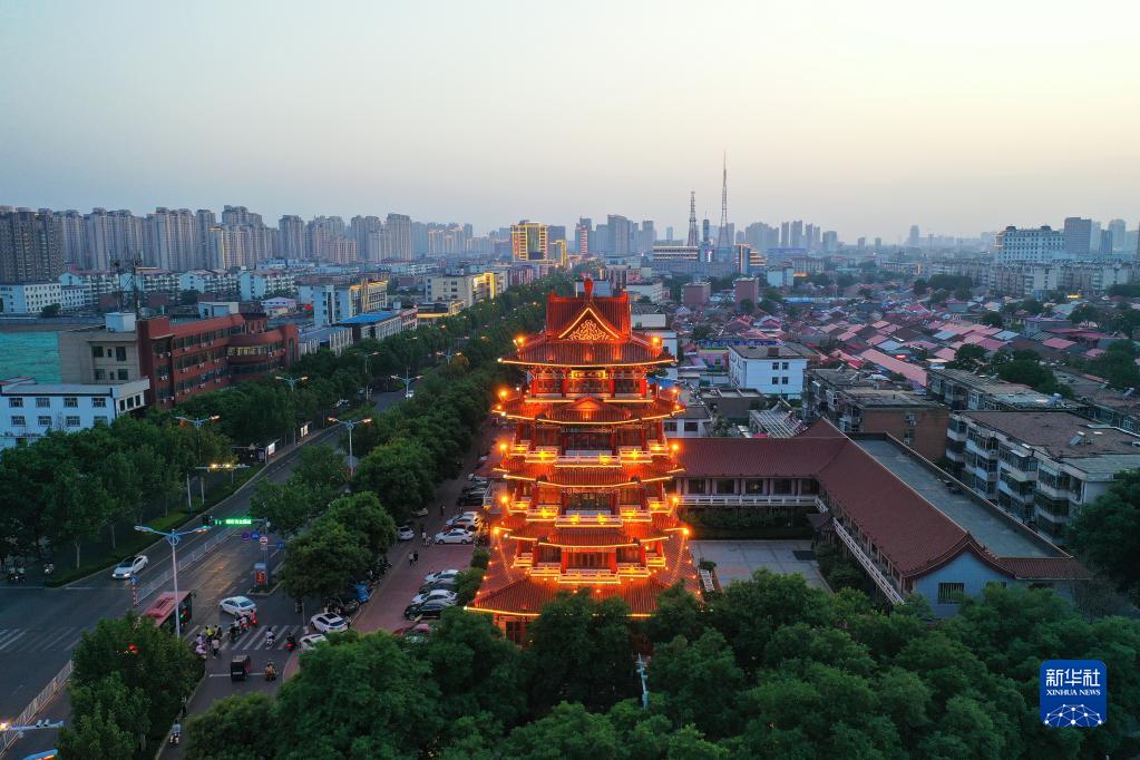 滄州市京杭大運河畔的清風(fēng)樓(5月15日攝,無(wú)人機照片)。