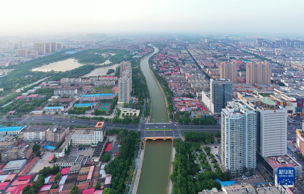 滄州市區境內的京杭大運河河道(5月15日攝,無(wú)人機照片)。