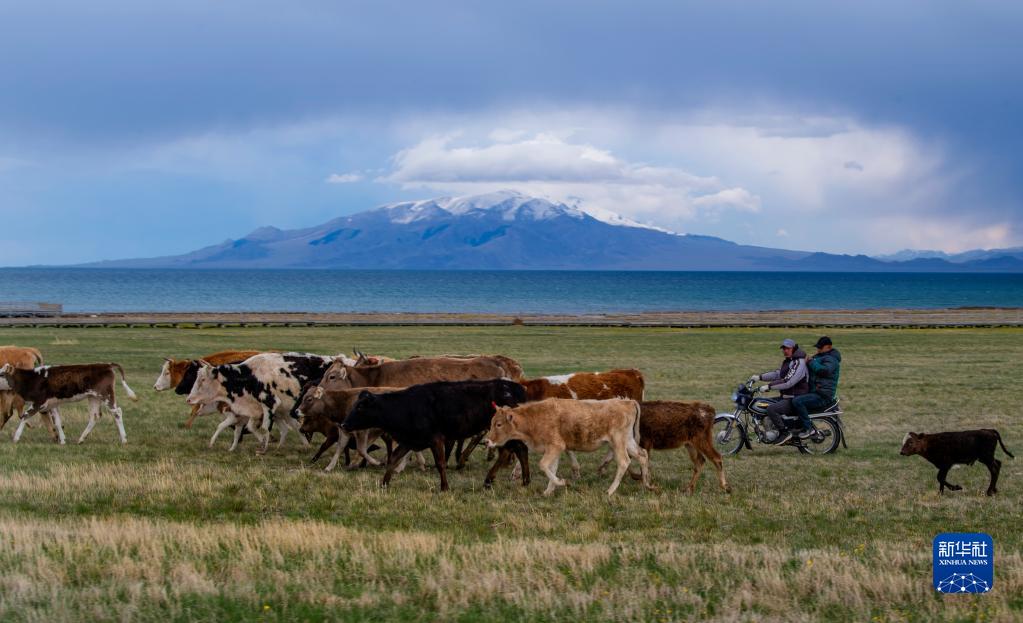 5月21日,牧民在新疆賽里木湖邊放牧。