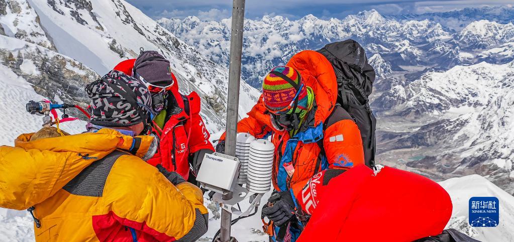 5月23日,科考登頂隊員在珠峰海拔約8830米處維護升級自動(dòng)氣象站。