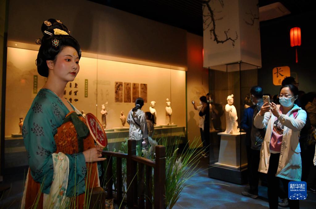 5月22日晚,在西安博物院《長(cháng)安有故里——絲路少年大唐行》展覽上,演員為游客呈現唐朝服飾。