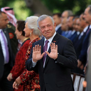 5月25日,在約旦首都安曼,約旦國王阿卜杜拉二世(中)參加獨立日慶典。