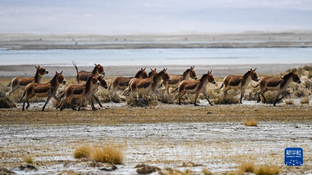 藏野驢在位于新疆東昆侖庫木庫里盆地的阿雅克庫木湖邊奔跑(5月23日攝)。