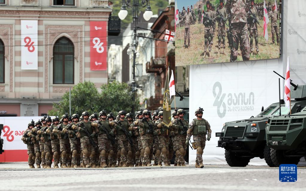5月26日,在格魯吉亞首都第比利斯,格魯吉亞軍人在自由廣場(chǎng)接受檢閱。