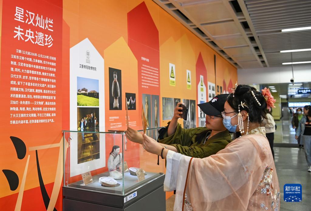游客在西安地鐵大雁塔站“星漢燦爛·未央遺珍——漢”主題展覽上打卡留念(5月27日攝)。