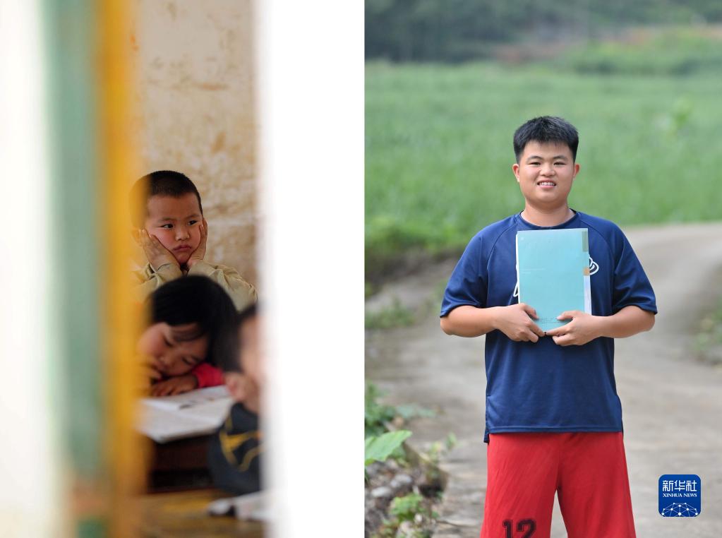 拼版照片:左圖為2012年3月27日,在大化瑤族自治縣大化鎮仁良小學(xué),6歲的韋康濤在教室里上課(新華社記者黃孝邦攝);右圖為在大化瑤族自治縣高級中學(xué)讀高二的韋康濤(新華社記者胡星宇 2023年5月21日攝)。韋康濤的夢(mèng)想是考上理想的大學(xué)。