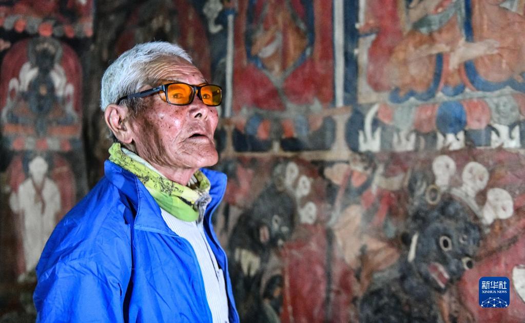 仁增旺扎老人查看壁畫(huà)(5月26日攝)。
