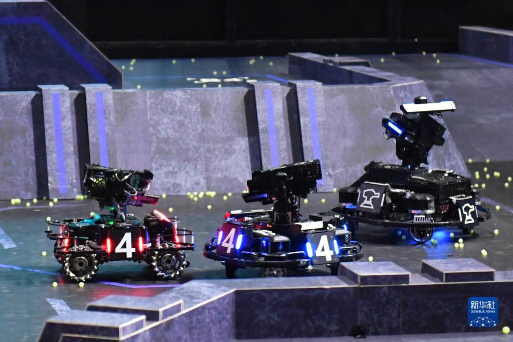 5月28日,大連交通大學(xué)TOE戰隊(藍方)和深圳大學(xué)RobotPilots戰隊(紅方)的機器人在比賽中交鋒。