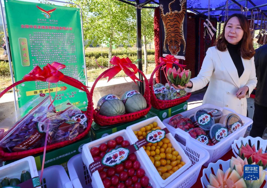 5月28日,珠峰博覽園的工作人員在第十屆白朗果蔬采摘節上展示自產(chǎn)的蔬菜、水果。