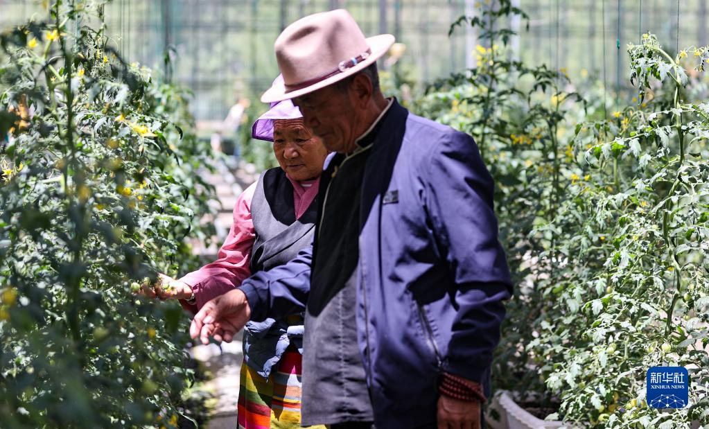 5月28日,參觀(guān)者在白朗縣珠峰博覽園的玻璃溫室中采摘蔬菜。