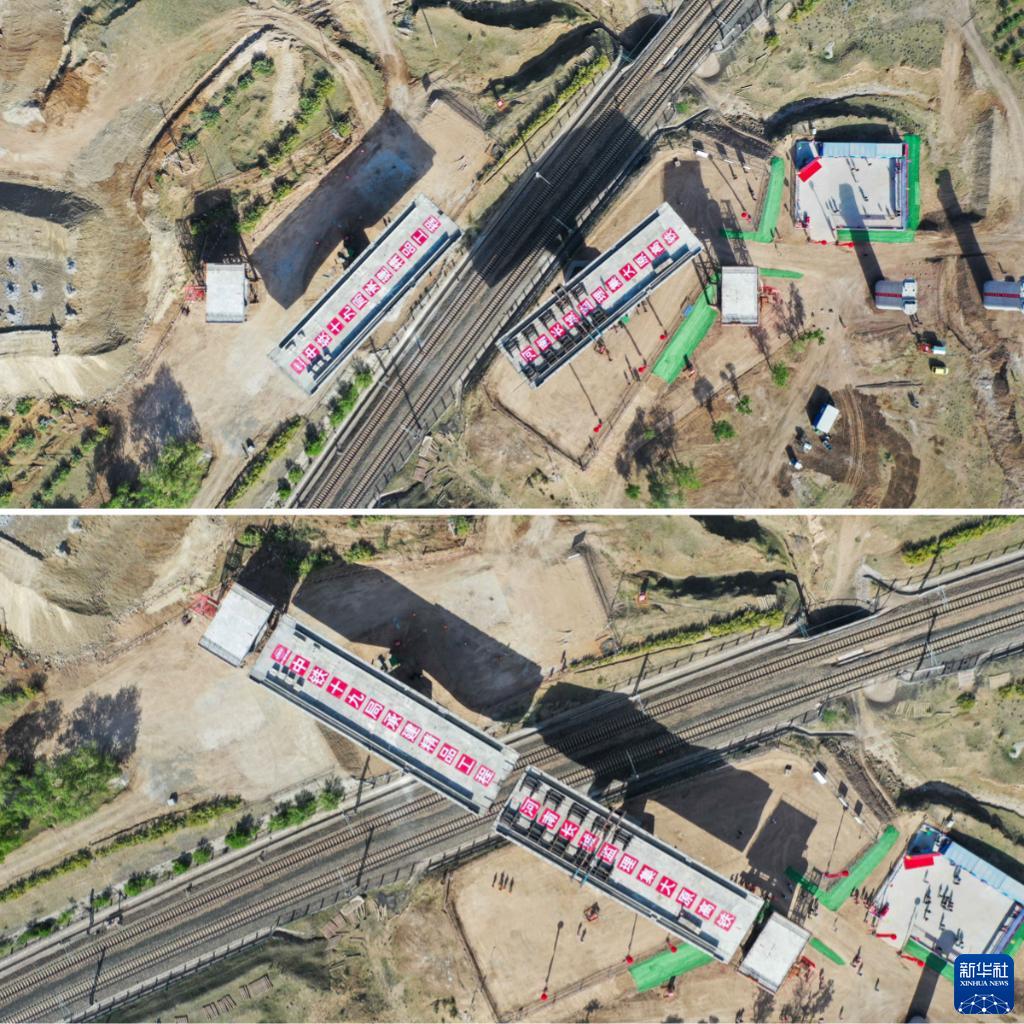 拼版照片:上圖為5月29日,集大原高鐵跨京包鐵路連續梁轉體中;下圖為5月29日,集大原高鐵跨京包鐵路連續梁轉體完成。