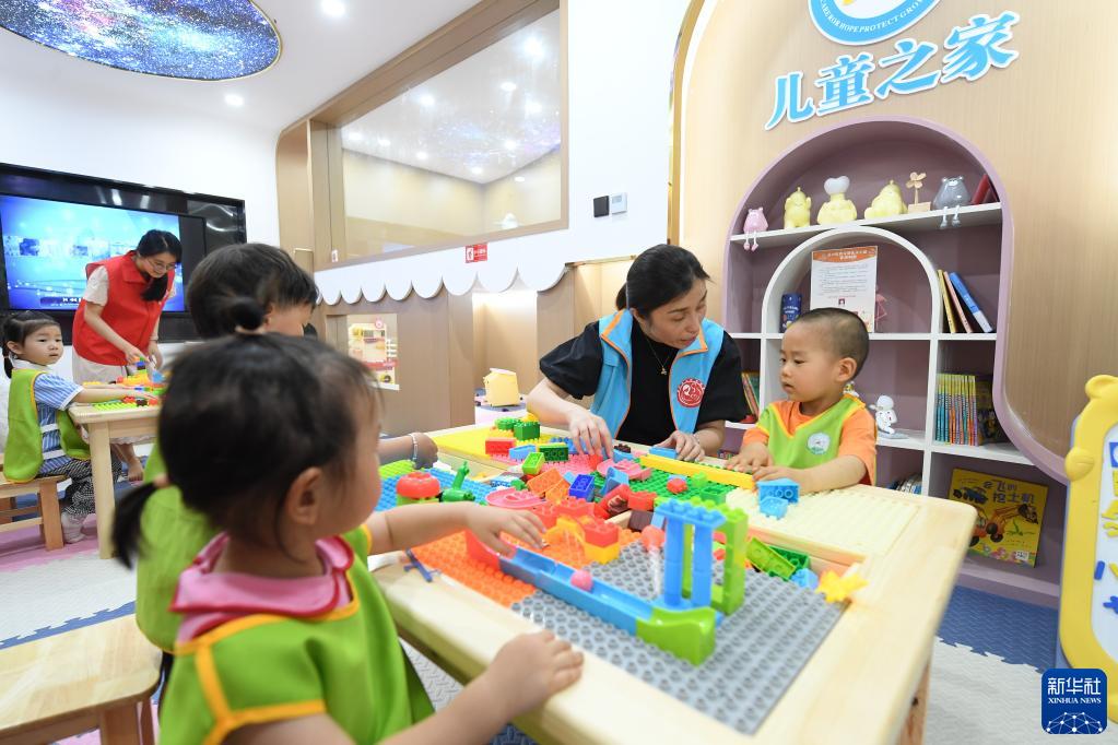 5月29日,在愛(ài)山街道利民社區,一個(gè)公益組織的老師帶著(zhù)兒童玩積木。