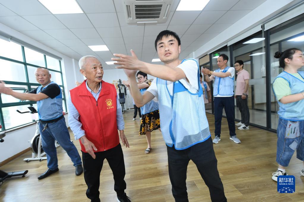 5月29日,在湖州市環(huán)渚街道玉堂橋社區,凌法林(左二)帶領(lǐng)殘障人士做操。