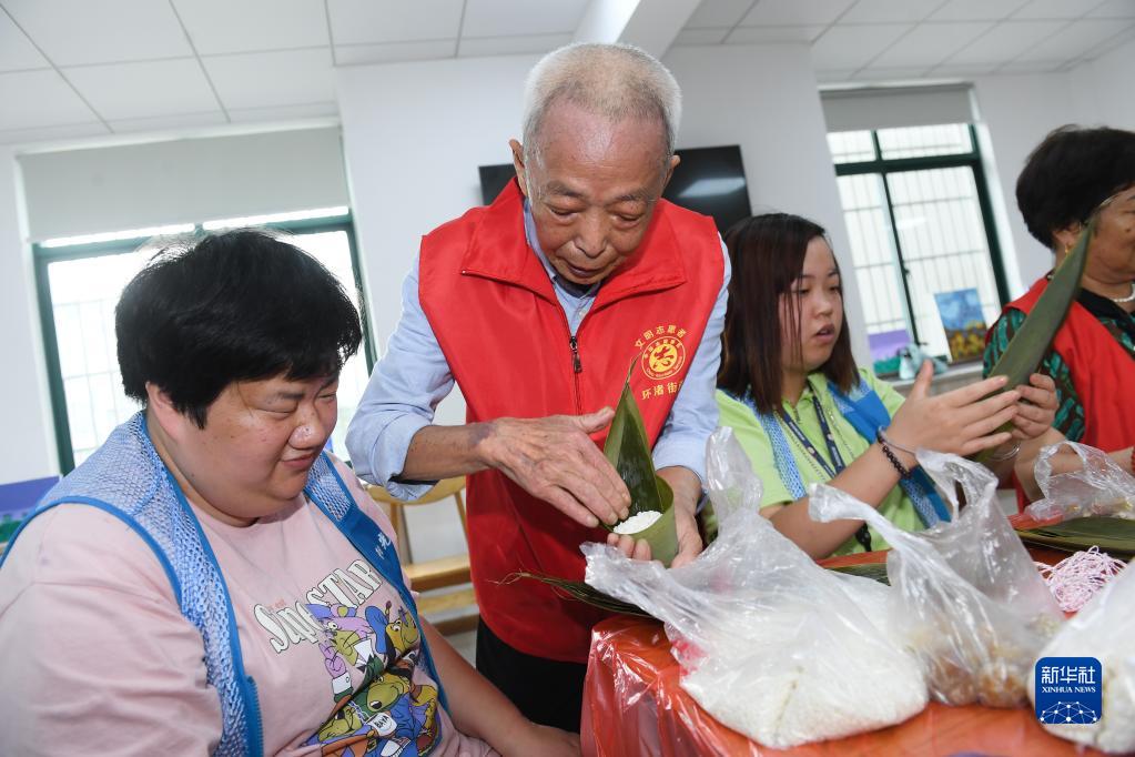 5月29日,在湖州市環(huán)渚街道玉堂橋社區組織的迎端午活動(dòng)中,凌法林(左二)和其他志愿者一起指導殘障人士包粽子。
