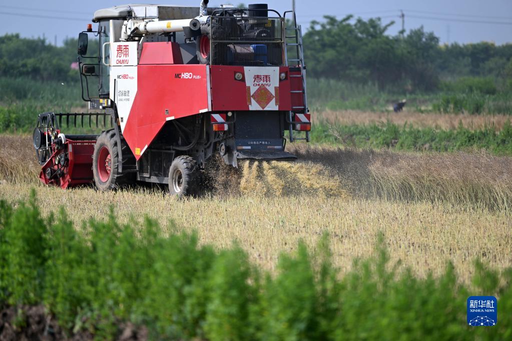 5月29日,聯(lián)合收割機在油菜田里收割菜籽。