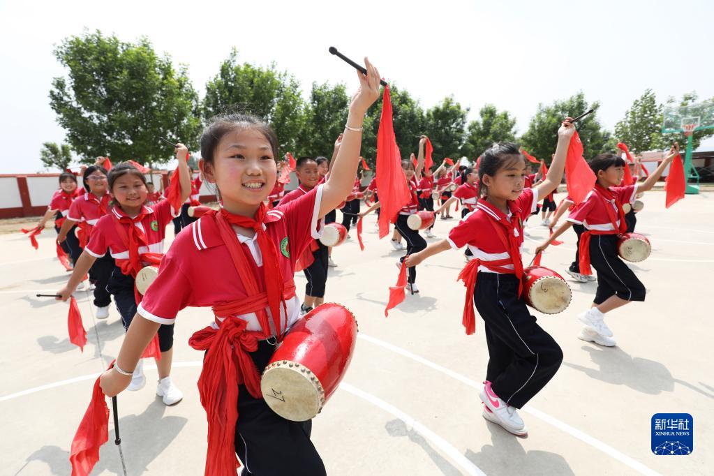 5月29日,在河北省唐山市豐潤區沙流河鎮葛家屯小學(xué)的民俗表演迎“六一”活動(dòng)中,小學(xué)生在表演腰鼓。